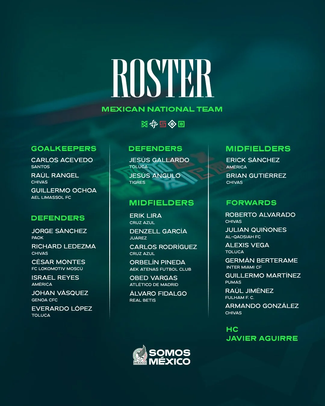 Head coach Javier Aguirre has put together a squad that mixes veteran leadership with young talent. The return of Guillermo Ochoa stands out, bringing experience and stability, while new faces like Álvaro Fidalgo and Obed Vargas add fresh energy to the team.